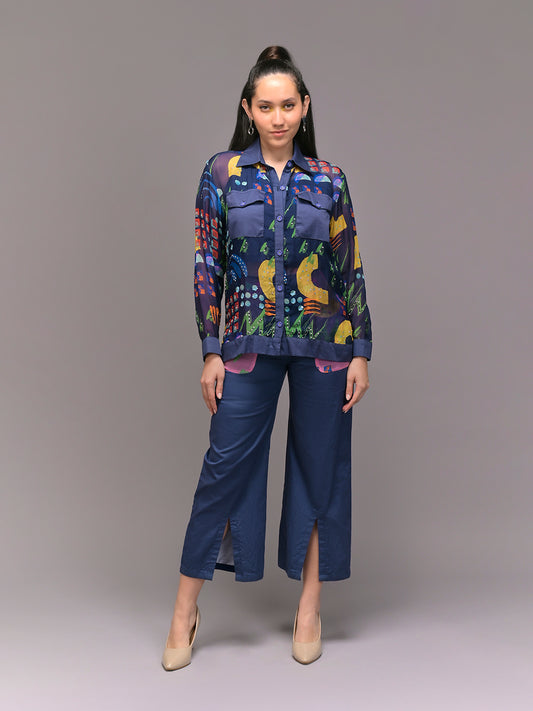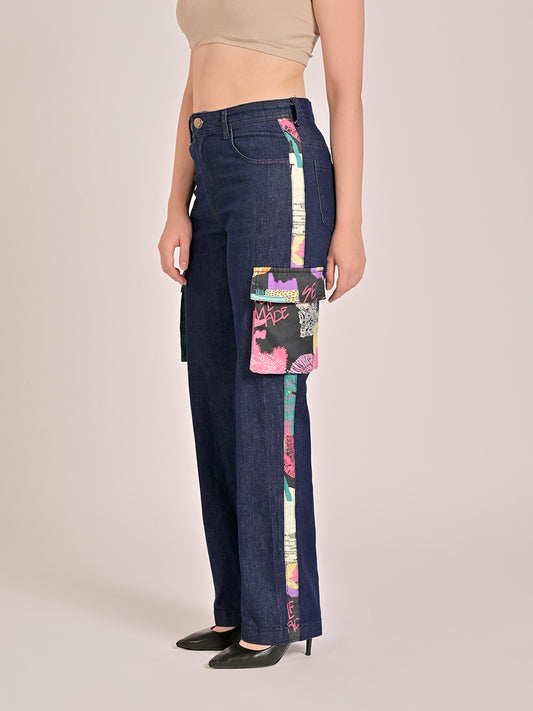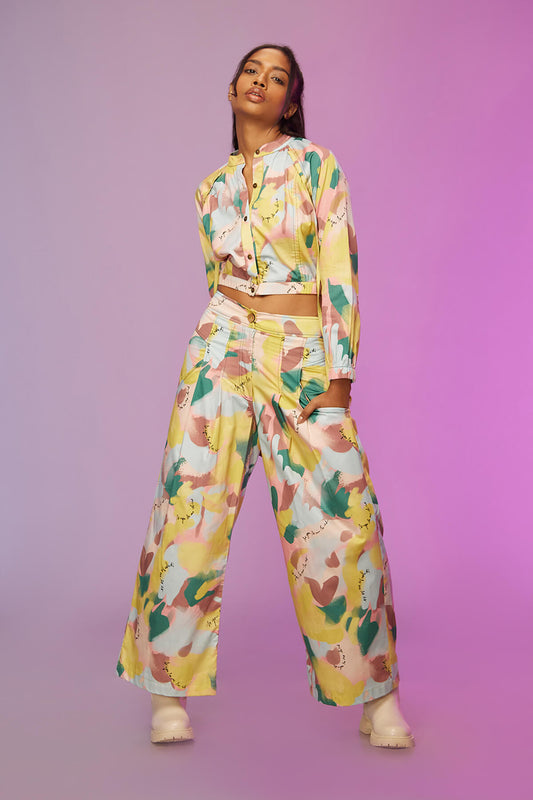 Lush Jungle Denim Jacket With Bralette And Wide Legged Pants